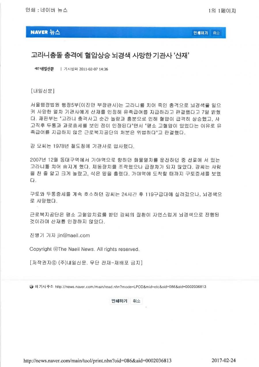 - 기사 : 고라니충돌 충격에 혈압상승 뇌경색 사망한 기관사 산재