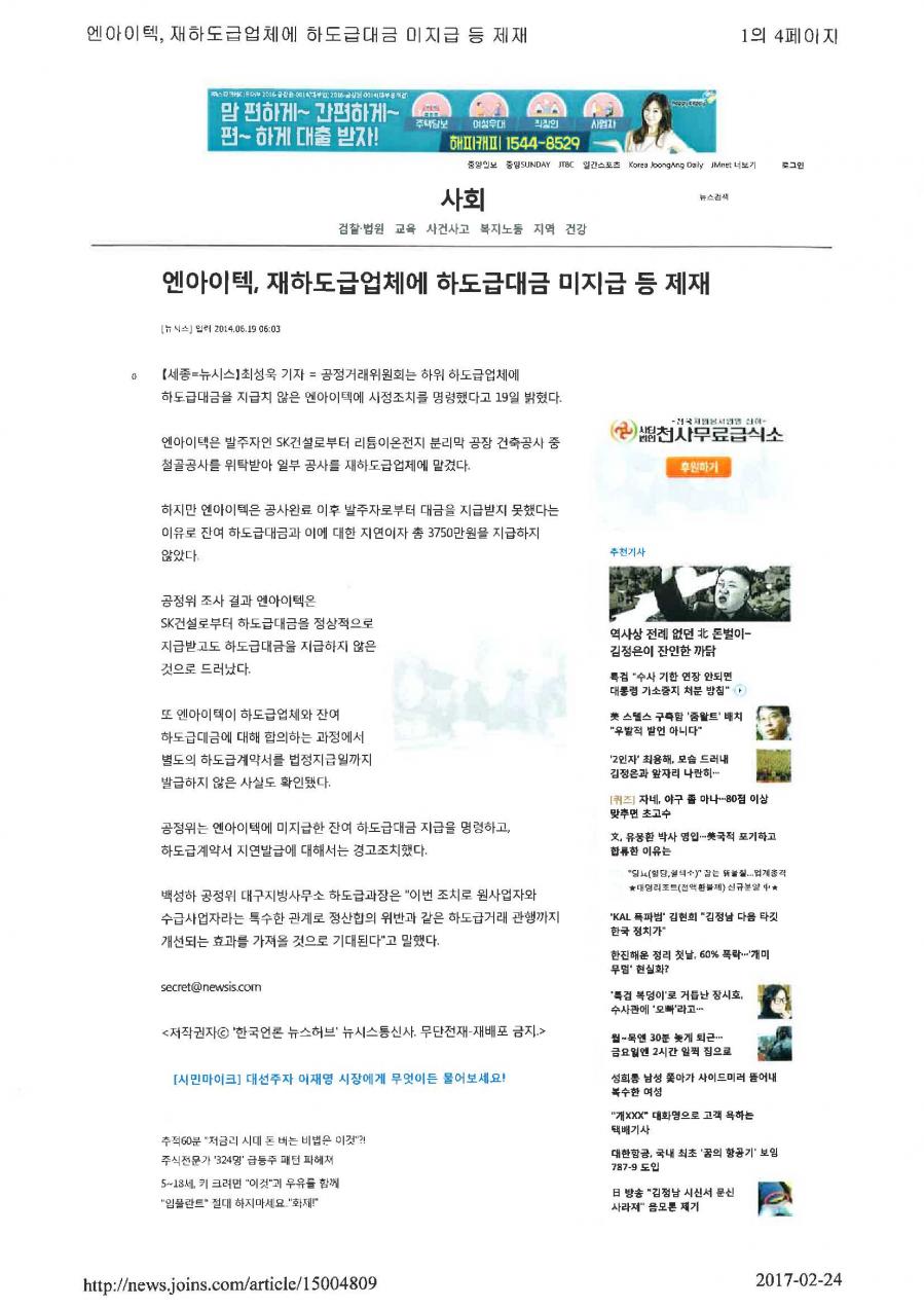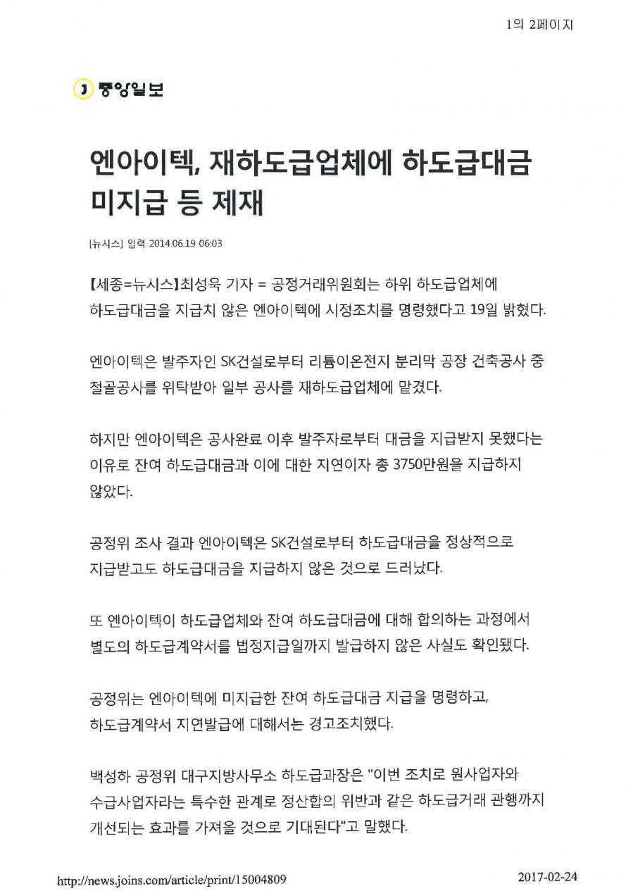 - 기사 : 엔아이텍, 재하도급업체에 하도급대금 미지급 등 제재